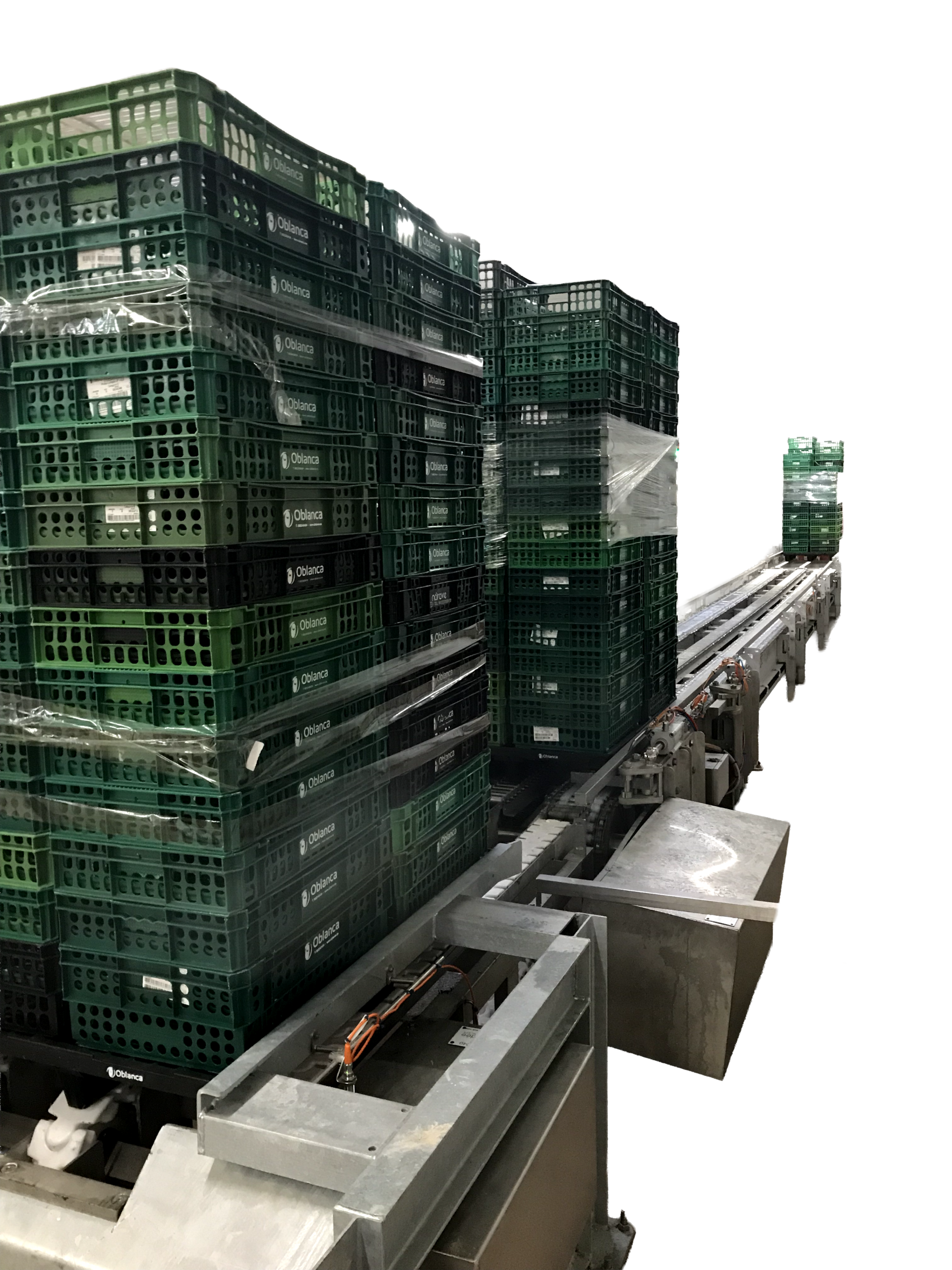 Pour optimiser l’emprise au sol, le process peut intégrer une fonction d’empilage des Geobox, jusqu’à 3 niveaux maximum, permettant de gagner en surface de stockage sans dégrader la logistique.
