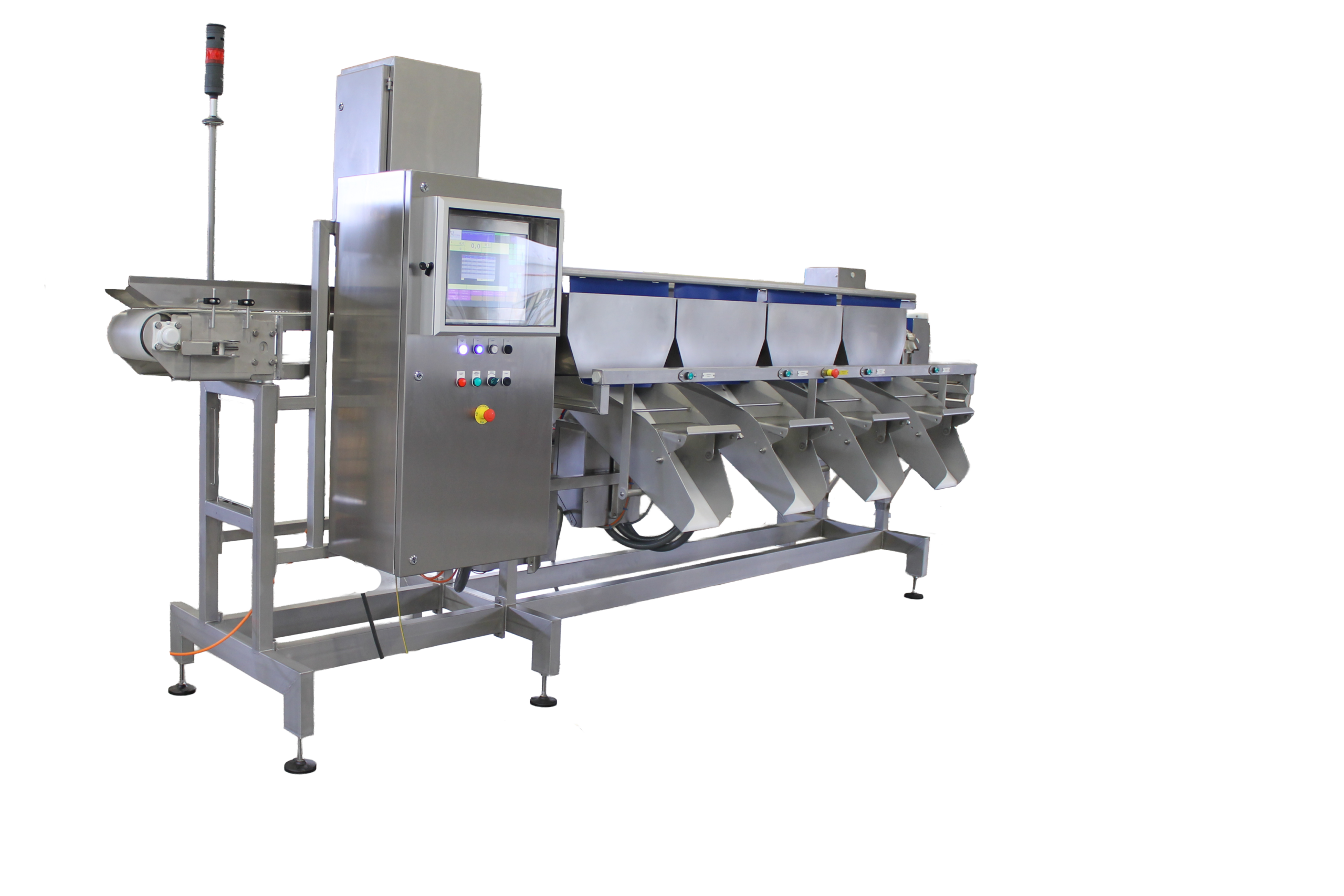 Les produits sont triés vers des goulottes de réception en inox équipées de bavettes caoutchouc