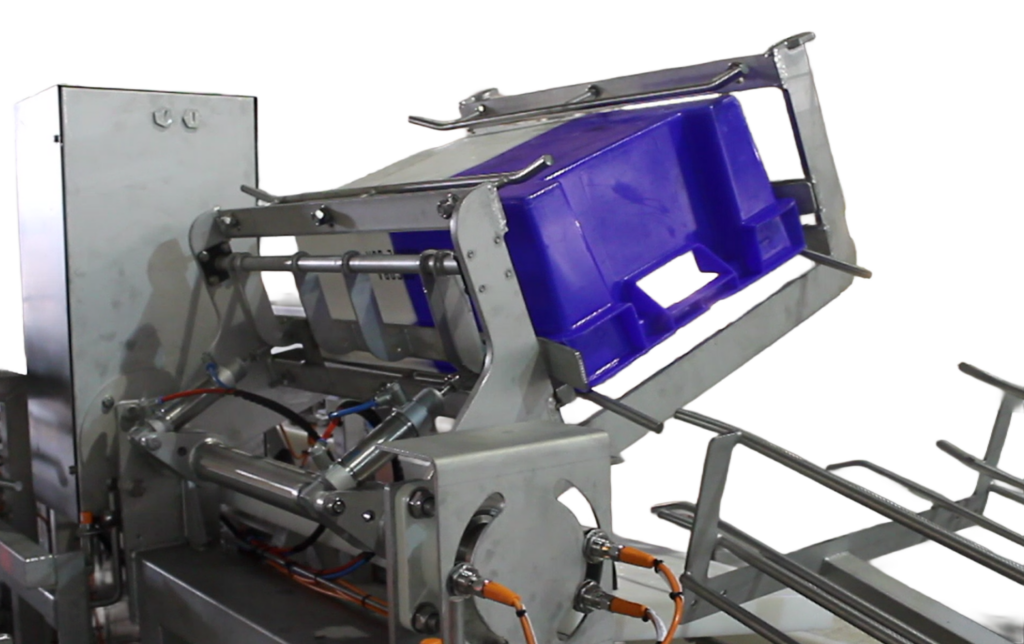 Les bacs contenant les blocs sont introduits manuellement par l’opérateur et acheminés un à un par un convoyeur à chaînes vers la zone de démoulage, où chaque bac est positionné et traité de manière unitaire et sécurisée. Le système assure une séparation précise du bloc de viande sans détérioration du produit, puis transfère les blocs démoulés vers un convoyeur dédié au flux produit.