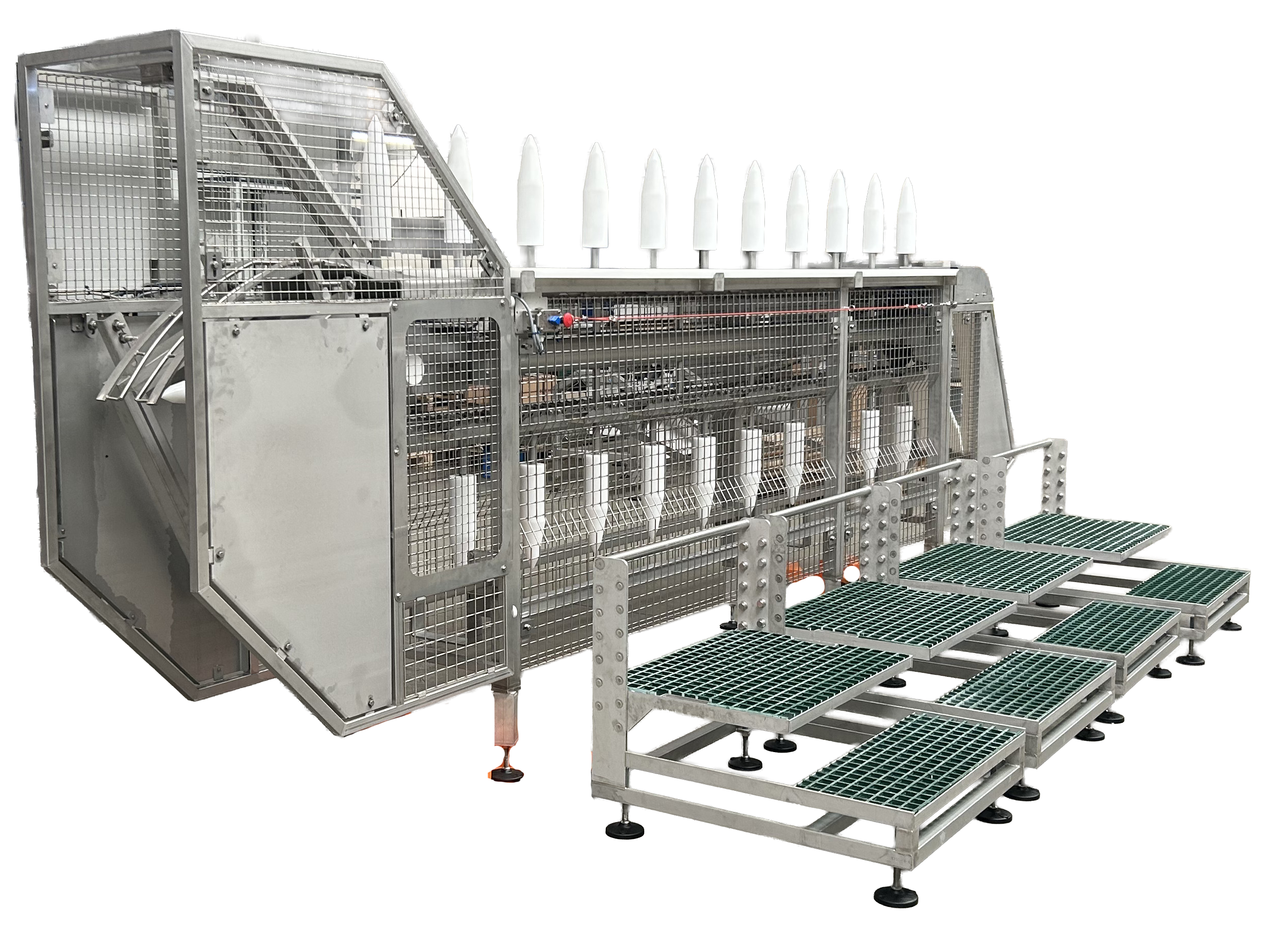 Spécifique à la découpe de produits entiers de volailles, la ligne à obus facilite le travail des opérateurs : chaque volaille est insérée dans un obus ; la bonne inclinaison du produit permet ainsi à l’opérateur une découpe précise et sans perte.